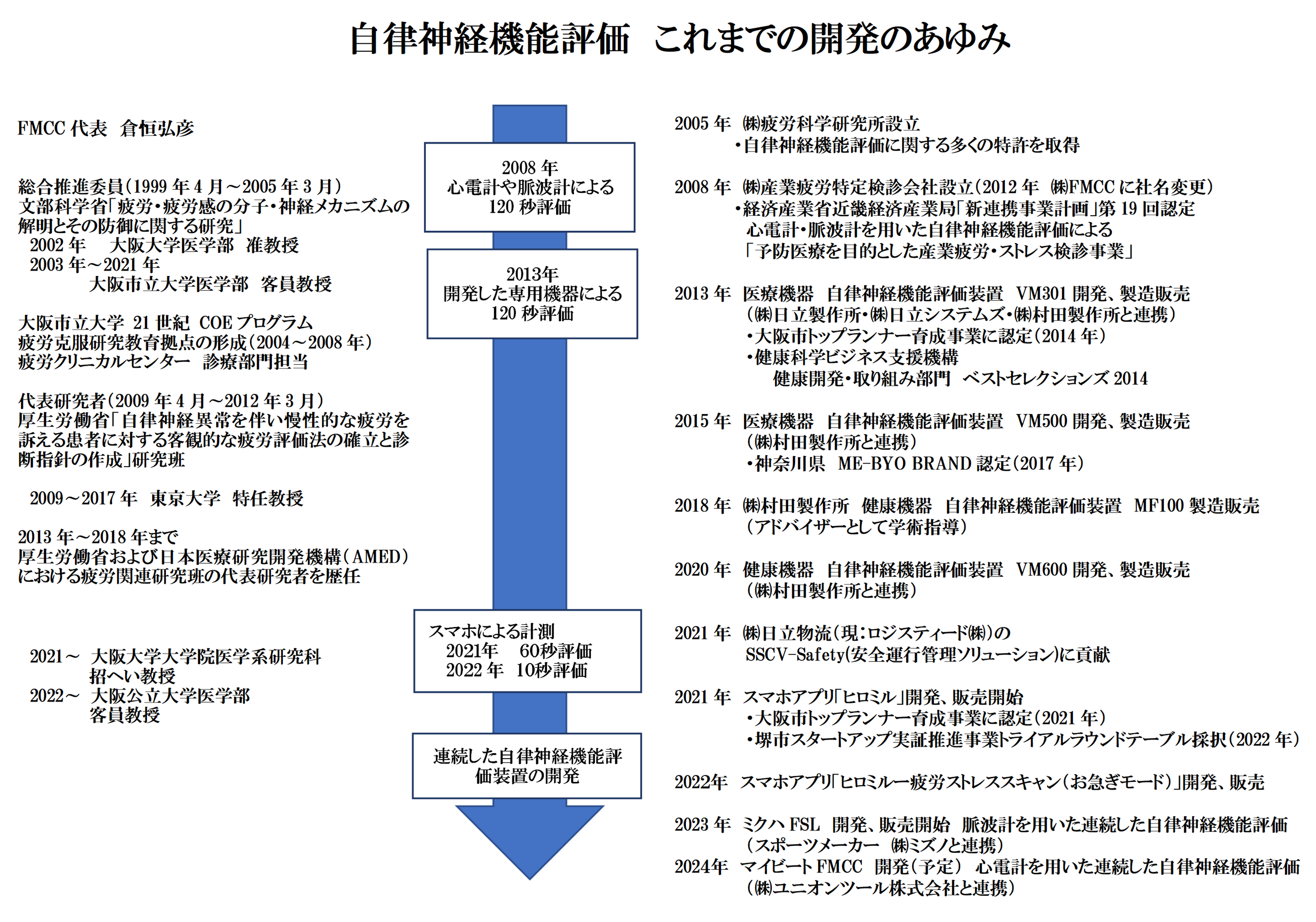 ㈱村田製作所は、これまでは心電波と脈波を同時に計測できる測定チップの製造のみを製造して㈱疲労科学研究所に納品し、㈱疲労科学研究所がそのチップを用いて自律神経機能評価装置を製造してきましたが、自律神経機能評価装置の有用性や今後の発展性を考えて、2018年には㈱疲労科学研究の金型を購入して自律神経機能評価装置(MF100(㈱村田製作所製造)、健康機器)を販売することになり、学術指導は倉恒弘彦が務めることになりました。2020年には、㈱疲労科学研究所も自律神経機能評価装置(VM600、健康機器)の製造販売を開始しています。
